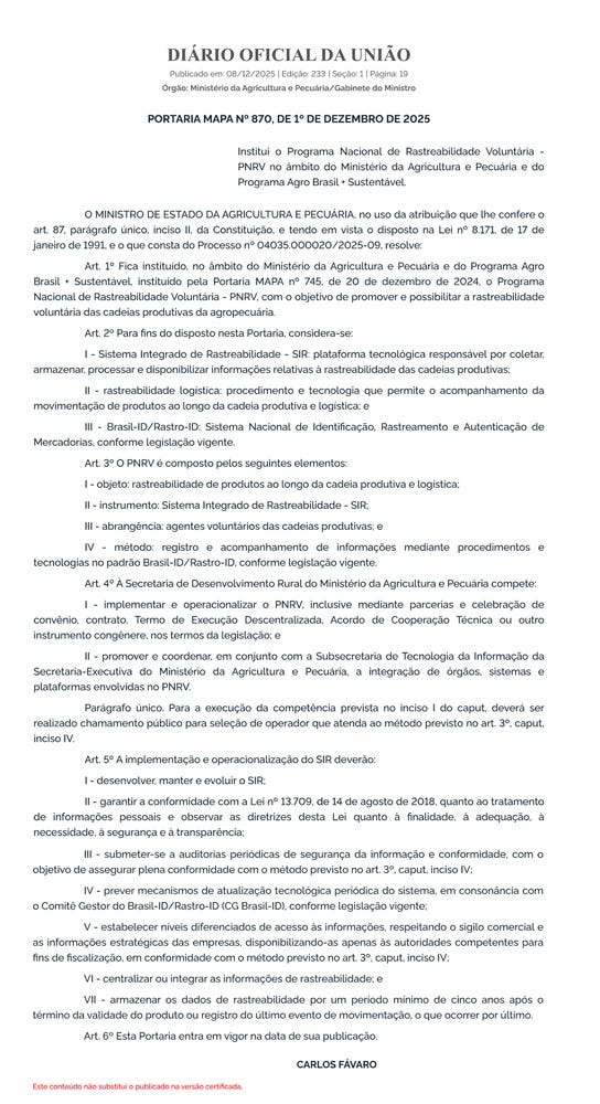 O Ministério da Agricultura e Pecuária publicou a Portaria 870/2025, instituindo o Programa Nacional de Rastreabilidade Voluntária (PNRV) como parte estruturante da Plataforma AgroBrasil+ Sustentável, com o objetivo de criar um padrão público capaz de integrar sistemas governamentais e privados.